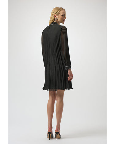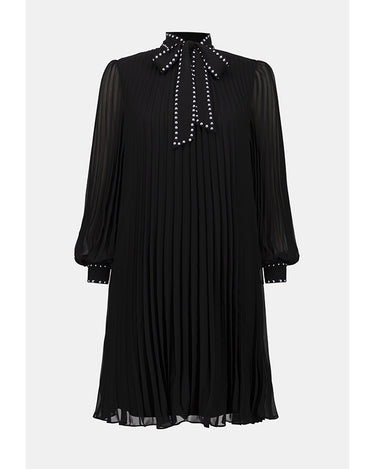 Designed for graceful movement, this pleated chiffon A-line dress is perfect for every twirl and sway. A stud-embellished necktie adds a touch of sophistication, while long puffed sleeves enhance its timeless charm. Falling elegantly at the knee, this dress is a stunning choice for any special occasion.