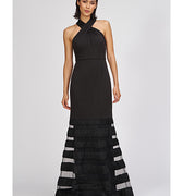 Striking black gown crafted from high-stretch scuba crepe knit for a sleek and flattering fit. Featuring a crossover halter neckline and a dramatic tulle skirt adorned with satin twill banding. Perfect for galas, black-tie events, and glamorous evenings.