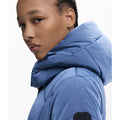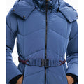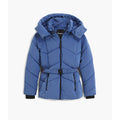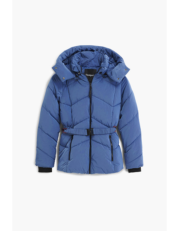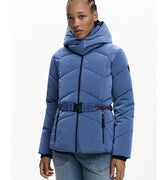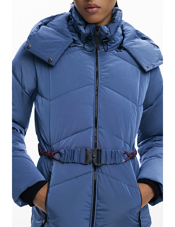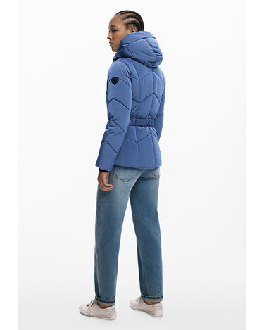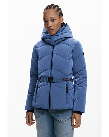 Short fitted padded jacket with iridescent finish, detachable hood, front pockets, and elastic belt.