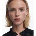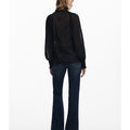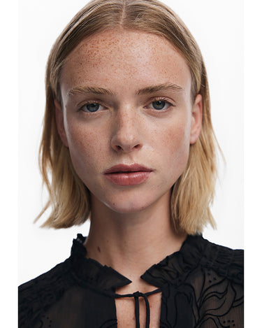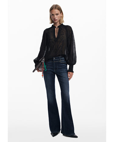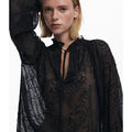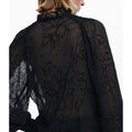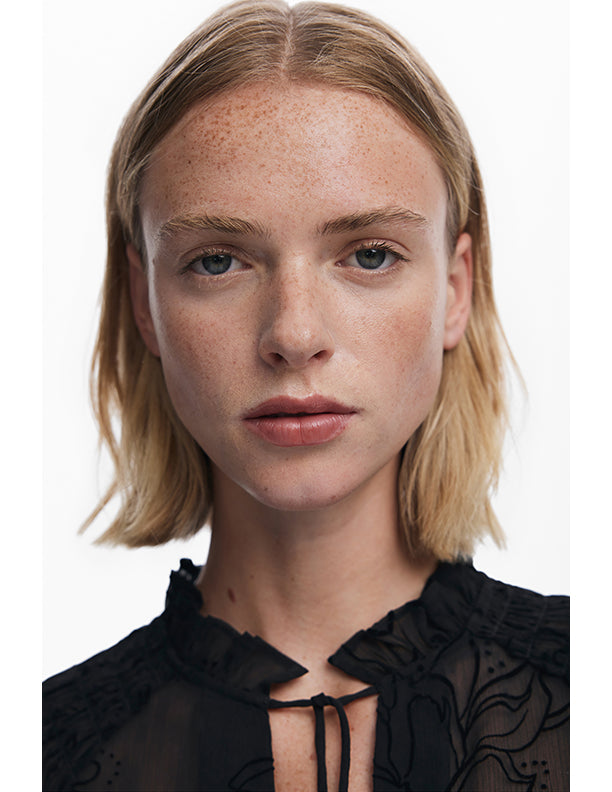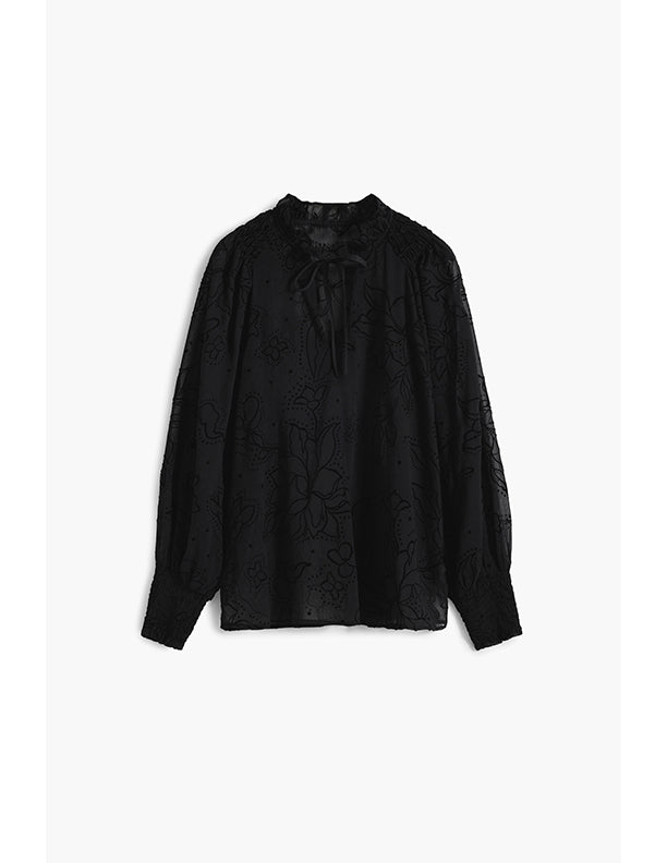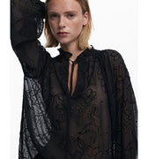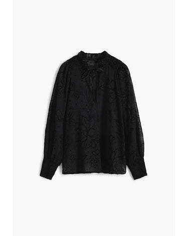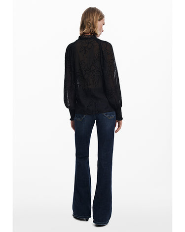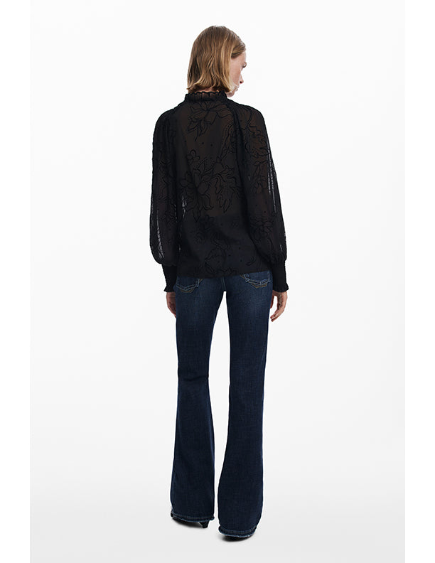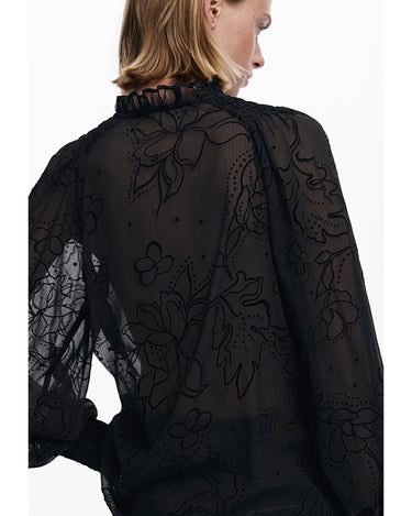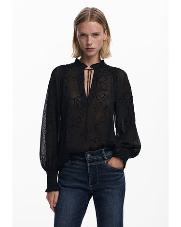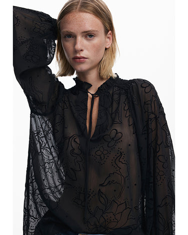 Blouse in slightly transparent fabric, with long puffed sleeves, V-neck with drawstring and ruffle detail at the collar in solid color adorned with floral motifs.