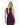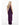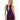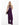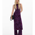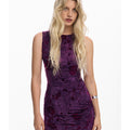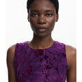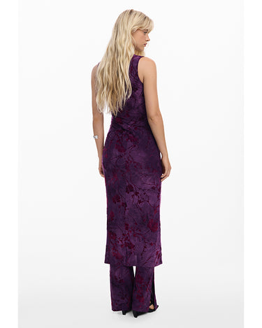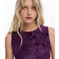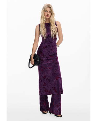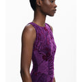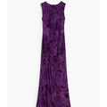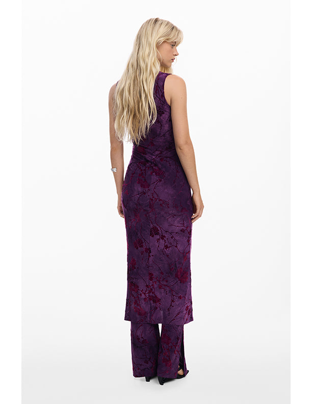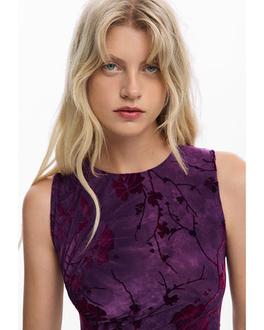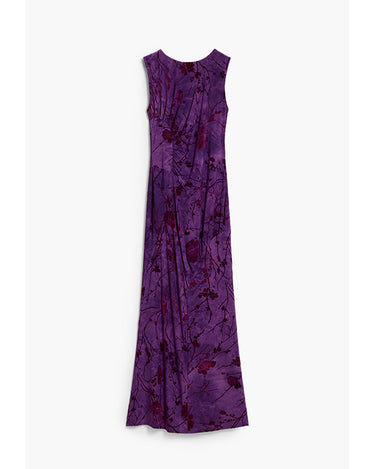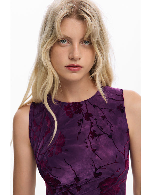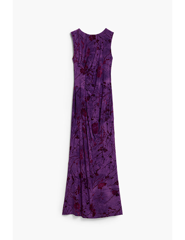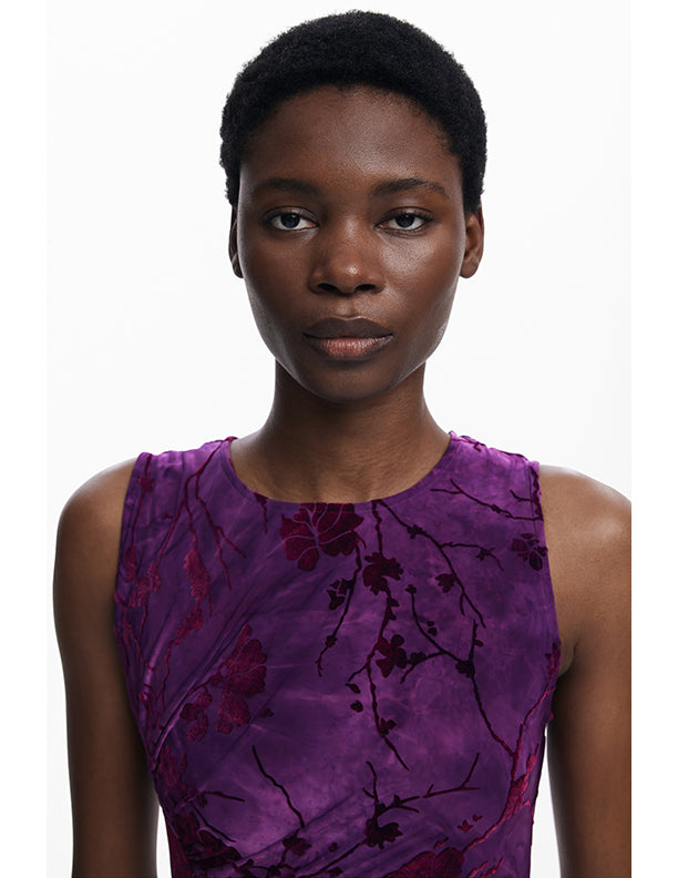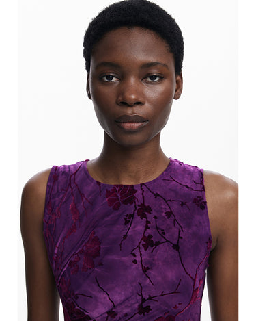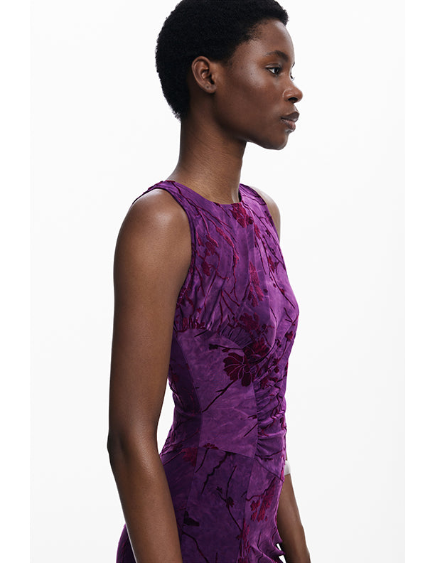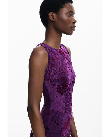 Midi dress with a round neck, sleeveless, and asymmetrical front draping with oriental floral print in purple tones.