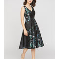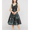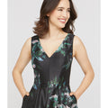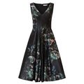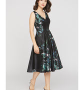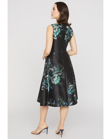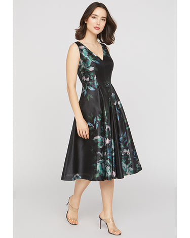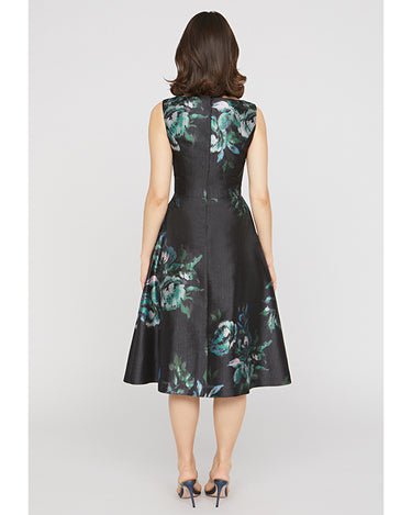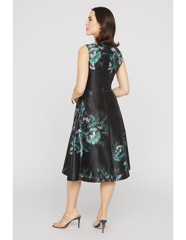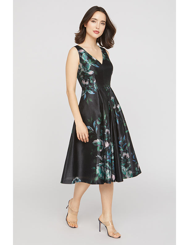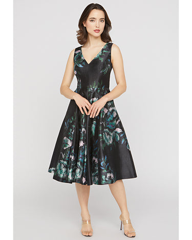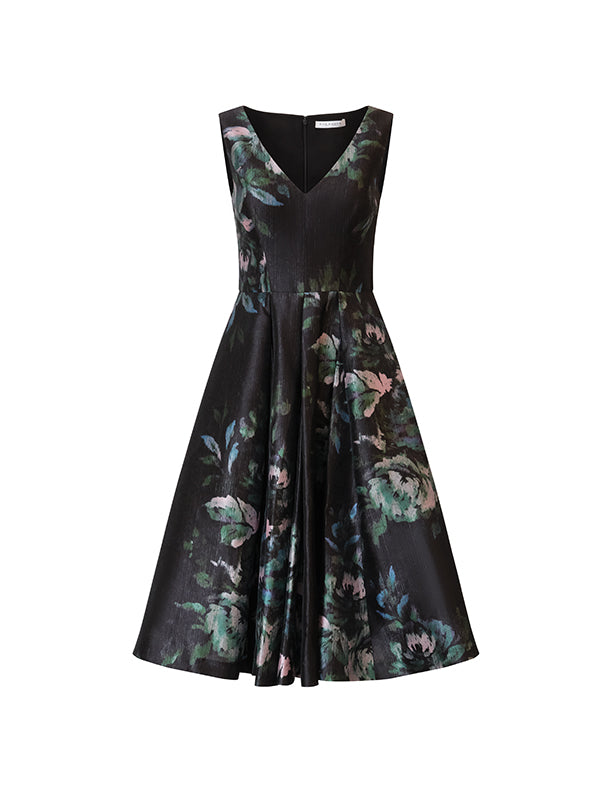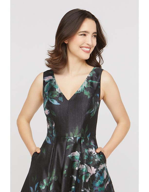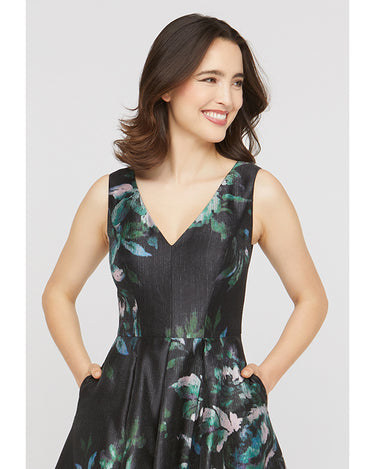 Painted floral print on metallic organza with a subtle sheen and rich texture. Finished with a pleated midi skirt for soft volume and structure. A romantic pick for artful weddings and festive winter soirées.