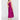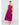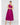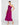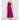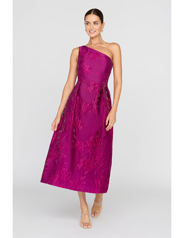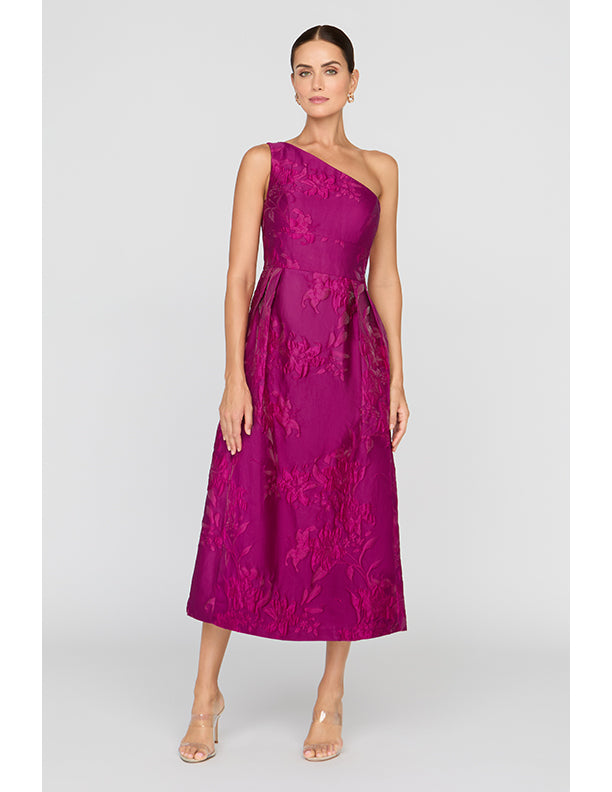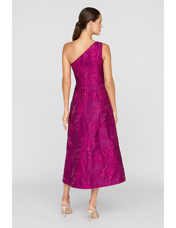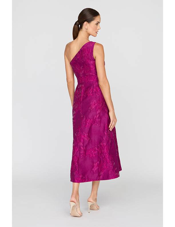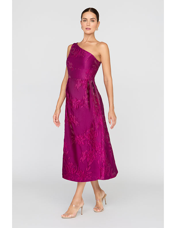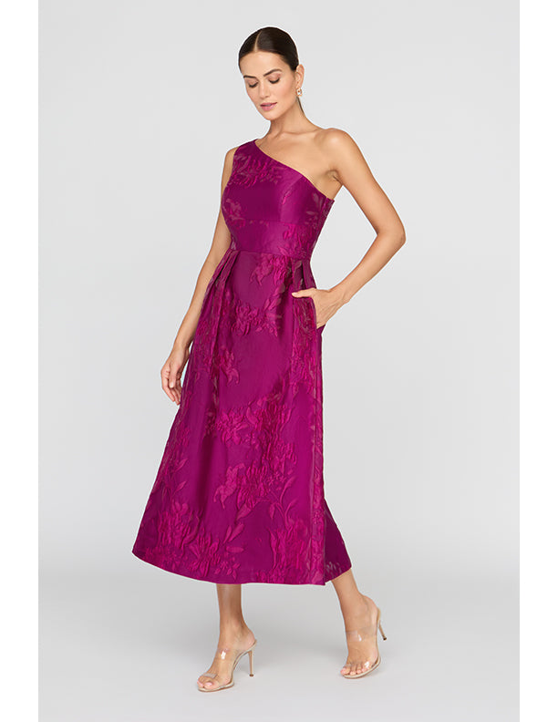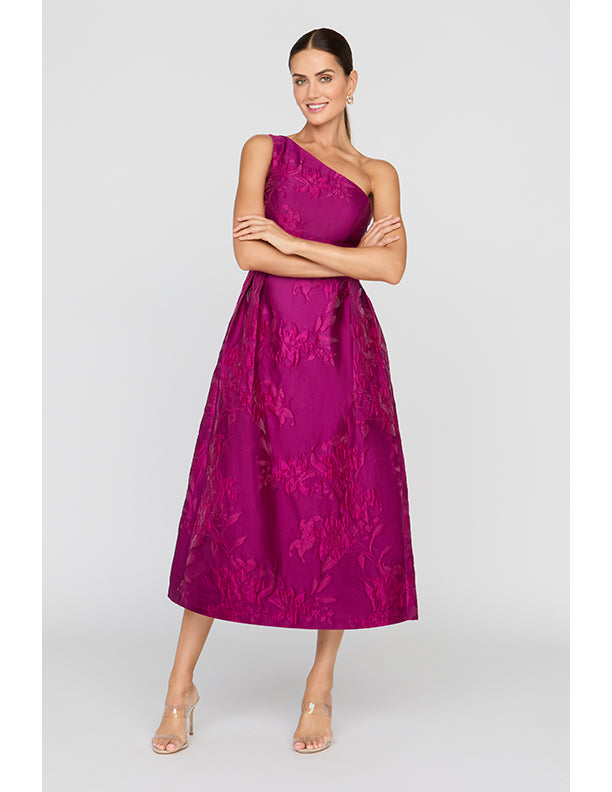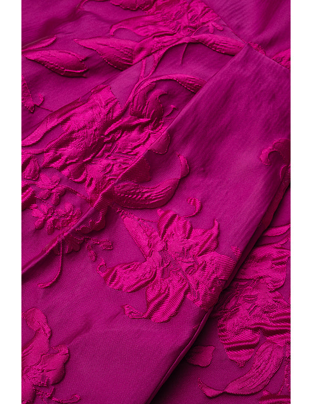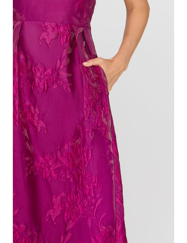 Floral jacquard dress rendered in a saturated berry hue with tonal botanical texture woven throughout. Sculpted through the waist with soft pleating that releases into structured volume. A vibrant statement for weddings, cocktail receptions, or evening celebrations.