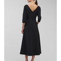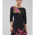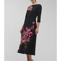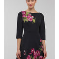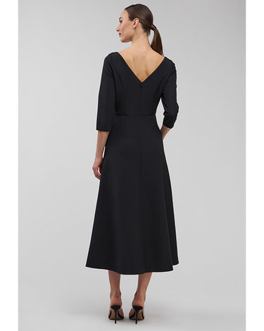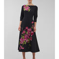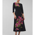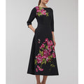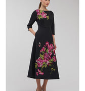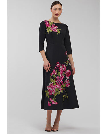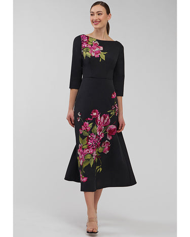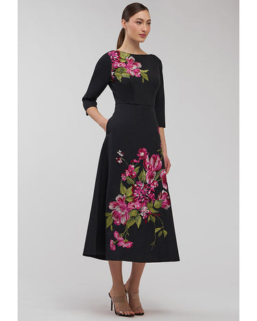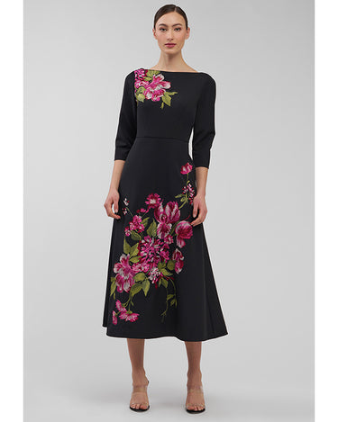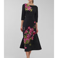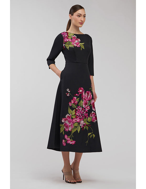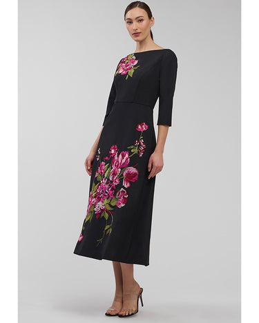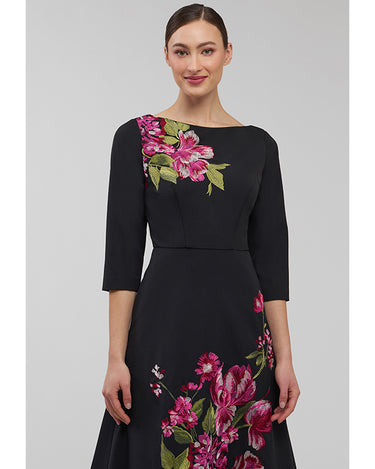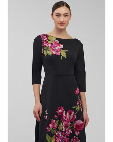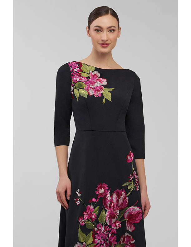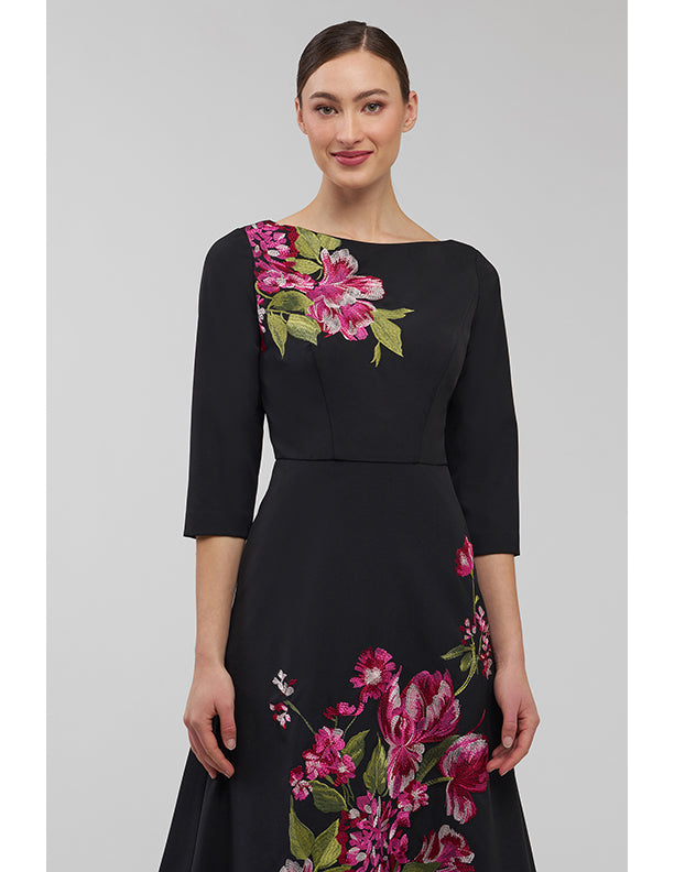 An embroidered stretch crepe midi dress with a graceful bateau neckline and three-quarter sleeves. The placement embroidery features vibrant fall blooms that trail across the bodice and skirt, adding texture and richness to the classic A-line silhouette. A polished pick for luncheons, theater nights, or seasonal celebrations.