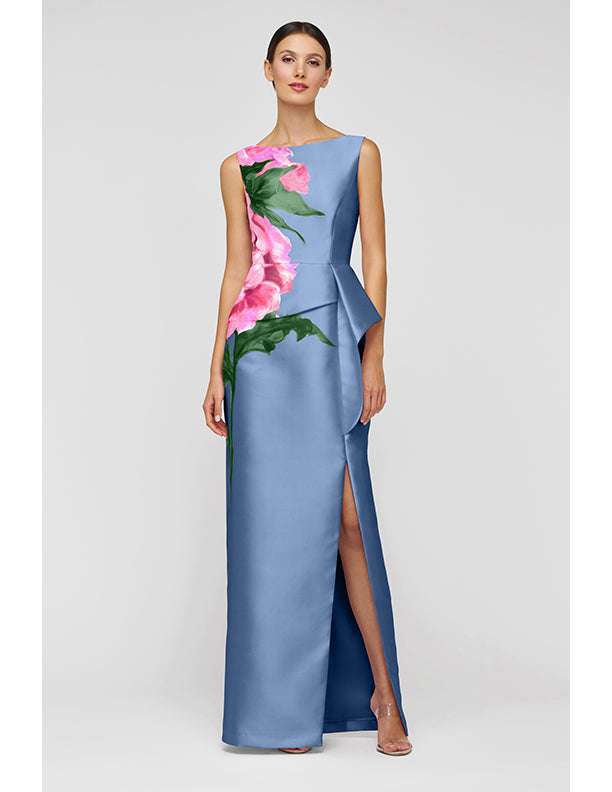 The Luciana Column Gown is a sleek and elevated choice for your special events. Featuring an heirloom rose print, an asymmetrical peplum with ruffle, and a sleek column silhouette with a front slit, it’s perfect for a guest-of look or any formal event.