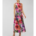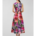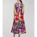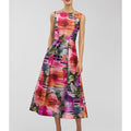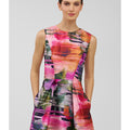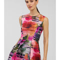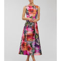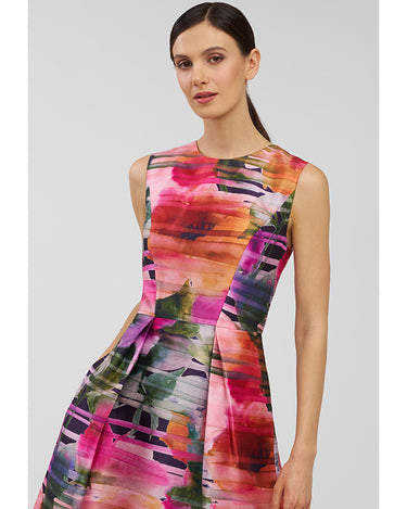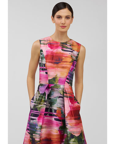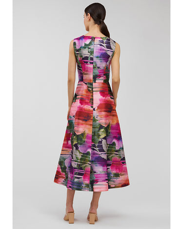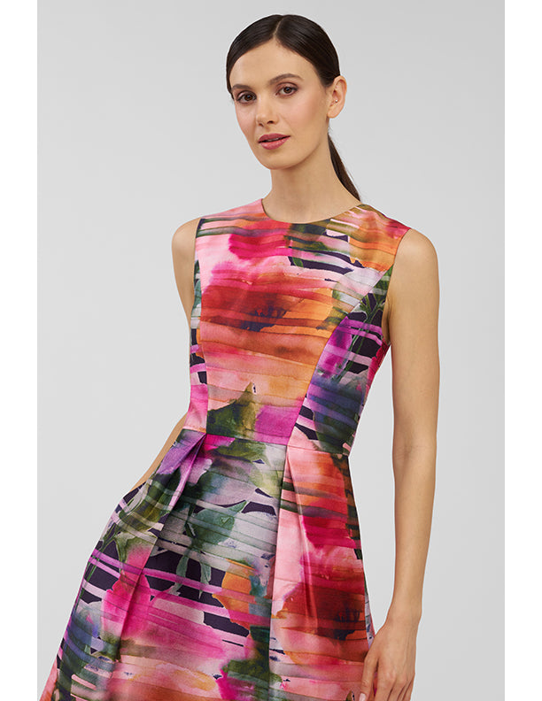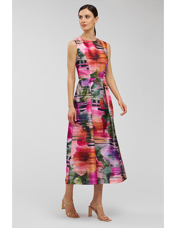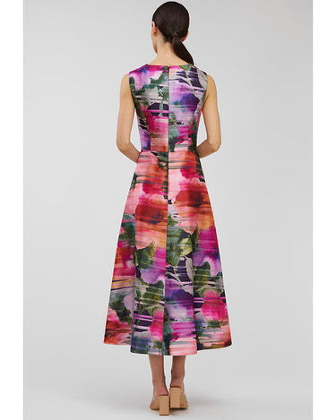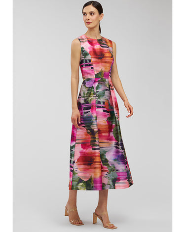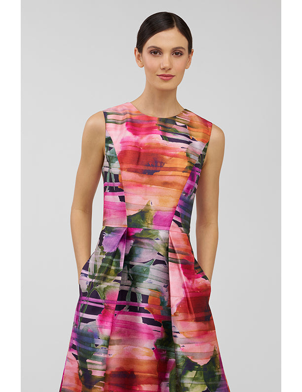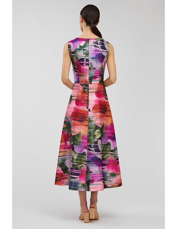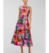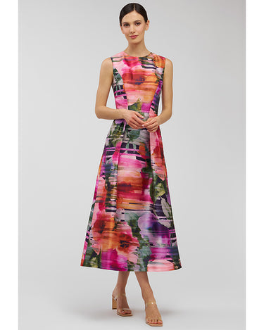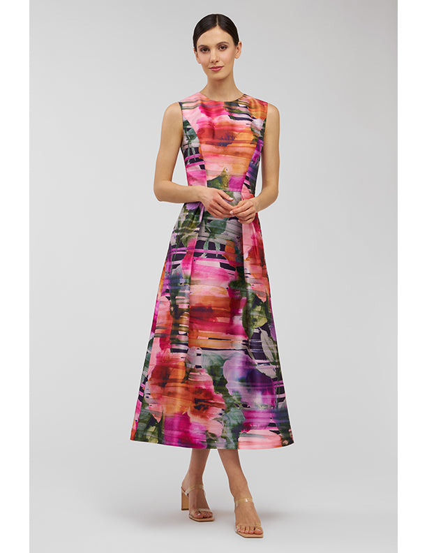 Printed metallic organza tea-length dress in a vibrant, painterly floral with a touch of shine. Designed with a jewel neckline, princess-seamed bodice, and a pleated A-line skirt that adds sculptural volume. A classic Kay Unger silhouette, perfect for fall fêtes, statement brunches, or dressing up a day at the museum.