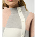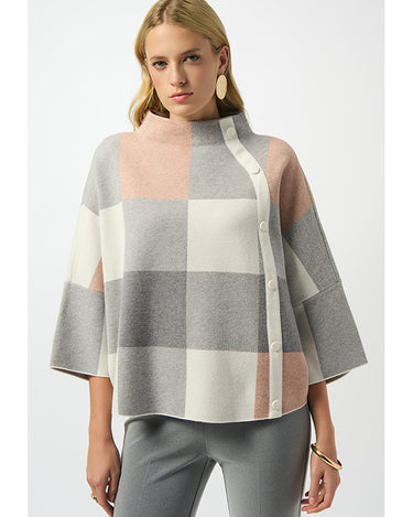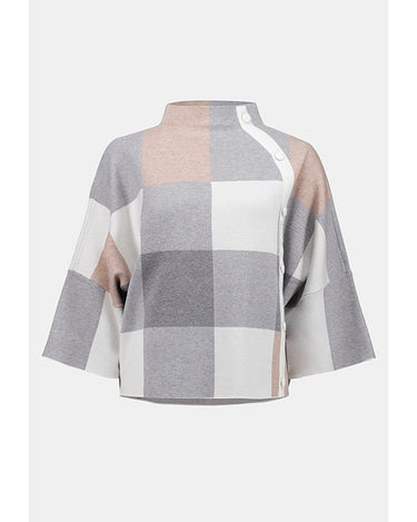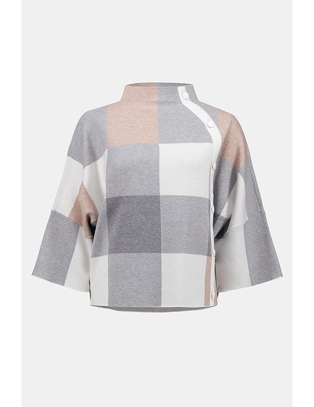 We all need a little plaid in our wardrobe. This cozy jacquard sweater knit top features a striking three-tone plaid pattern that's just as extraordinary as its design. A loose-fitting funnel neck adorned with decorative buttons on the side, along with three-quarter bell sleeves and a roomy fit give this piece an endlessly attractive appeal.