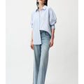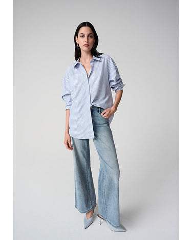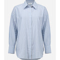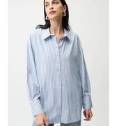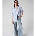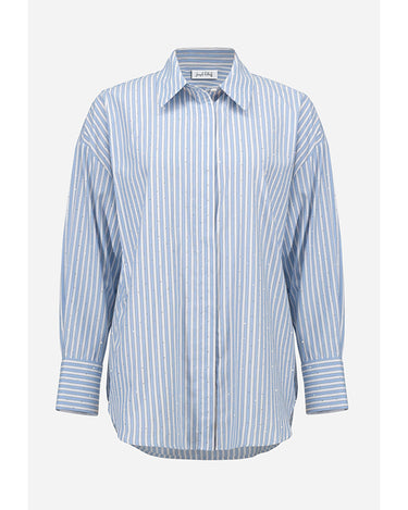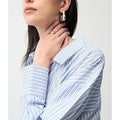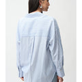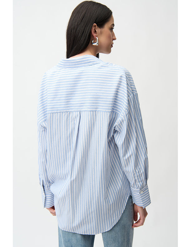 Crafted from lightweight Tencel, this woven striped blouse features a boxy silhouette and hidden button placket. All-over iron-on details add a unique touch to this casual, unlined piece.