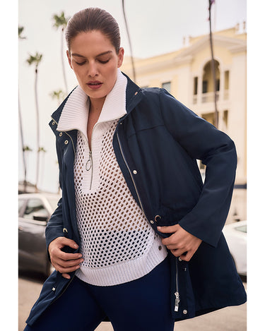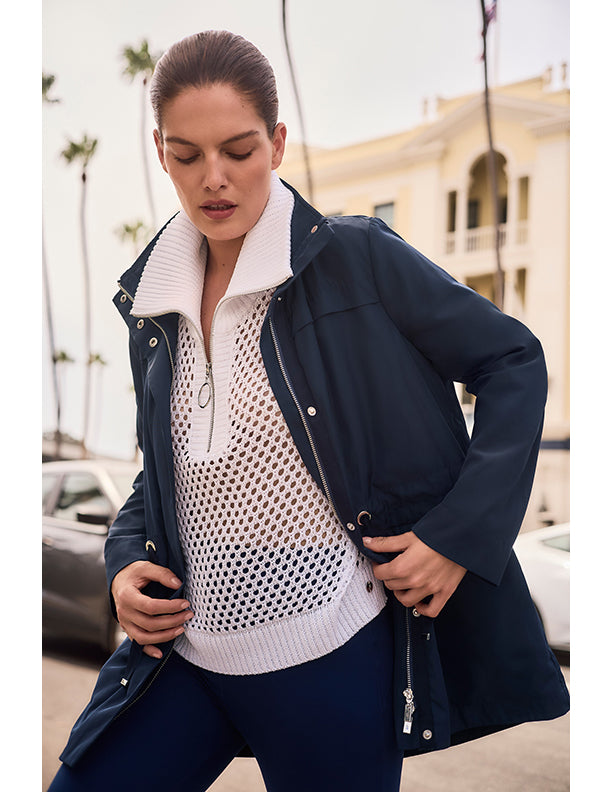 - Zip-up neckline with ribbed mock collar