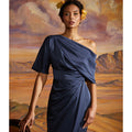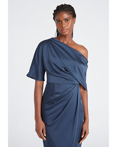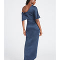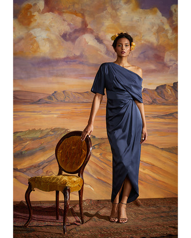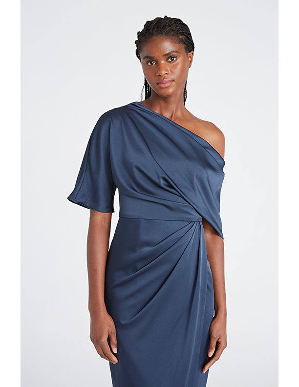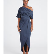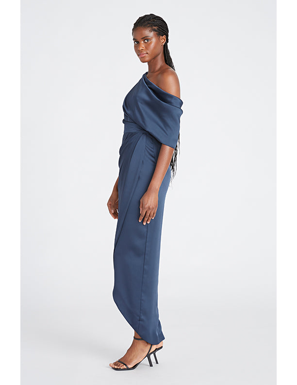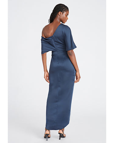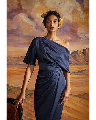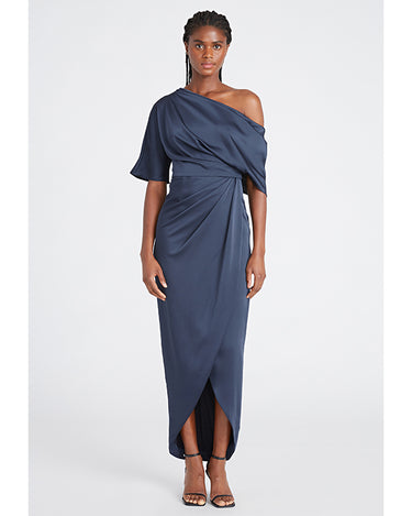 Introducing the Rayna Gown — a minimal masterpiece in smooth satin. Designed with an asymmetrical neckline, this piece features a single sleeve and a soft wrap-style skirt, creating a fluid silhouette with a modern touch.