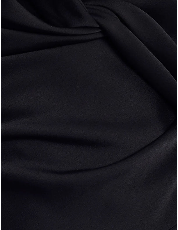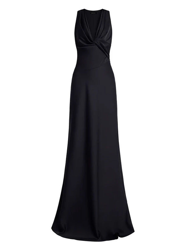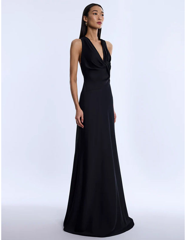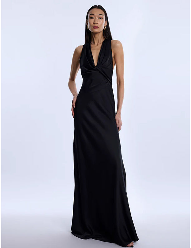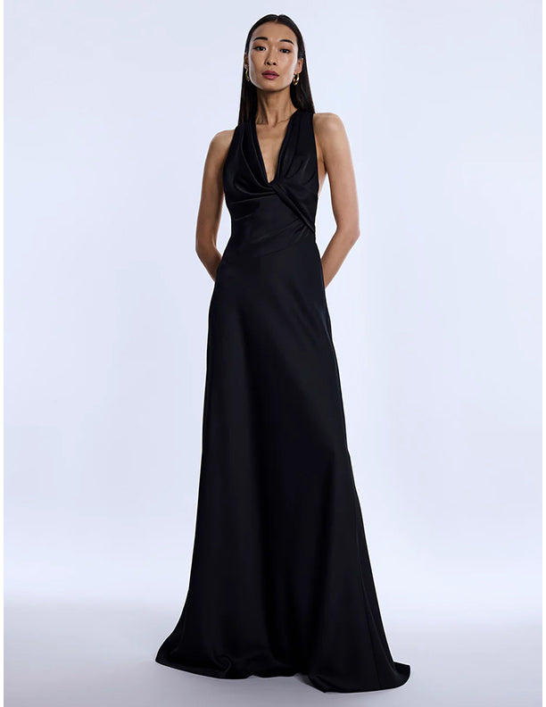 Sleek black gown cut from fluid satin with a soft, lustrous finish. Artfully draped through the bodice with a twisted front detail that flows into a clean, elongated skirt. Finished with an open, sculpted back for a striking balance of drama—made for black-tie evenings and formal nights that call for impact.