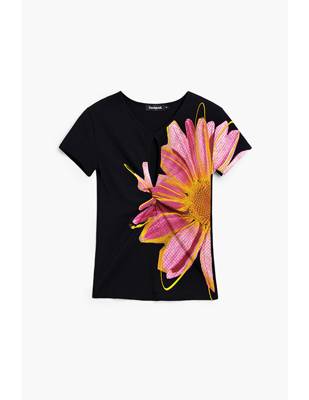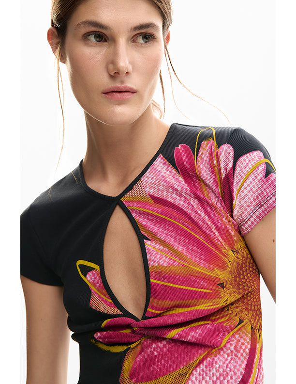 Short-sleeved ribbed knit shirt with front chest opening and large flower print on the front.