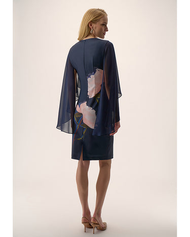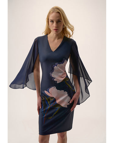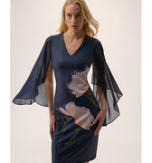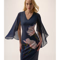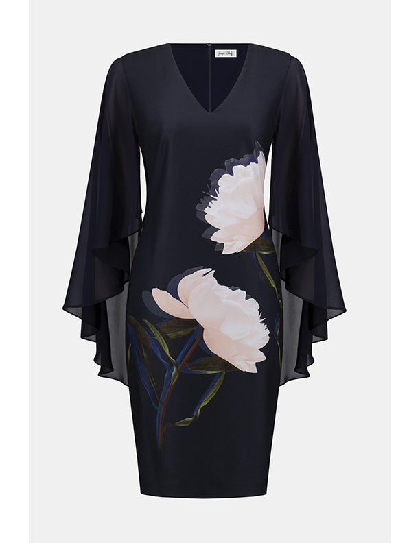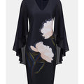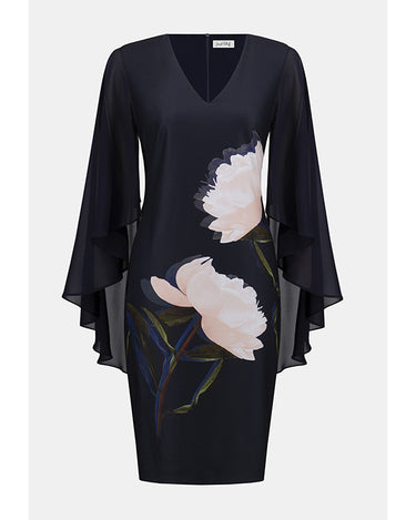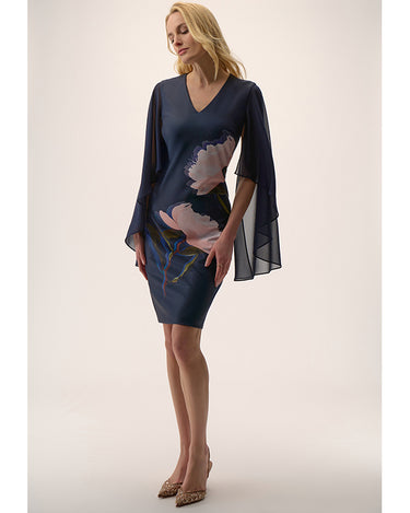 Elegant and effortlessly chic, this sheath dress features flowy chiffon cape sleeves and a captivating floral print, making it perfect for any special occasion. Crafted from luxurious silky knit, it offers a comfortable fit with a flattering drape that falls gracefully below the knee.