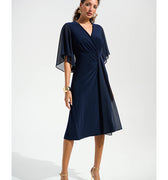 - Three-quarter chiffon hi-low bell sleeves