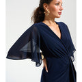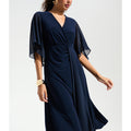 A wrap-style silhouette with elegant ease, this fit and flare dress features chiffon hi-low bell sleeves and a dramatic sash draped into the skirt slit. Designed with a flowing sweep and soft shirring at the bodice. Part of the Signature collection.