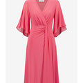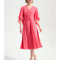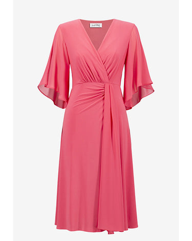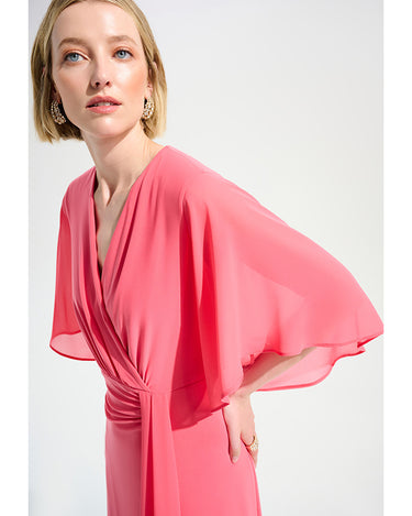 A wrap-style silhouette with elegant ease, this fit and flare dress features chiffon hi-low bell sleeves and a dramatic sash draped into the skirt slit. Designed with a flowing sweep and soft shirring at the bodice. Part of the Signature collection.
