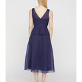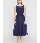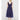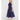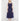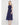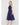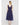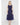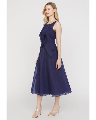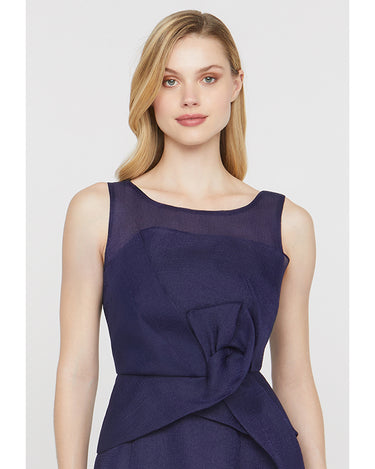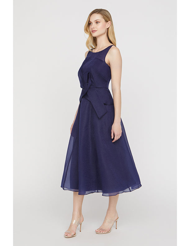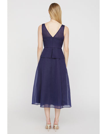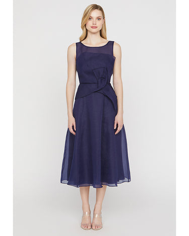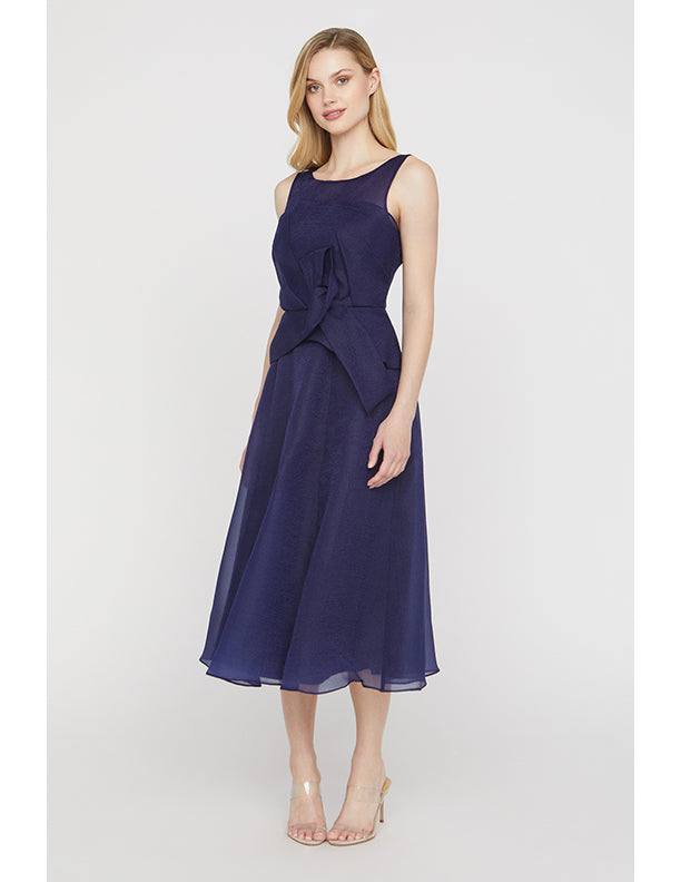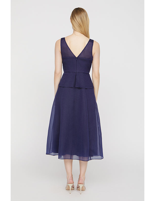 Cut in blue-violet textured organza, this cocktail dress features a sheer yoke, asymmetric pleating through the bodice, and a twisted peplum detail that adds playful structure. Finished with a V-back and midi hem—it moves like a dream and photographs even better.