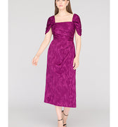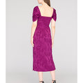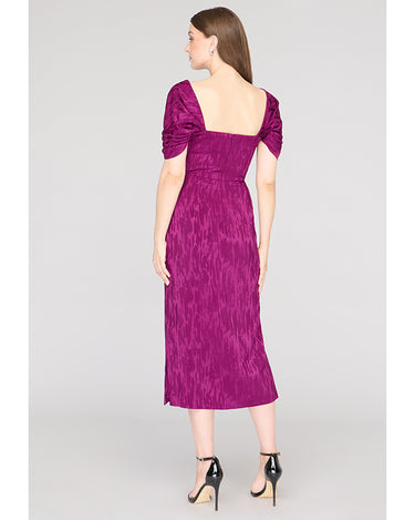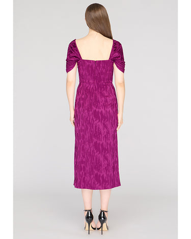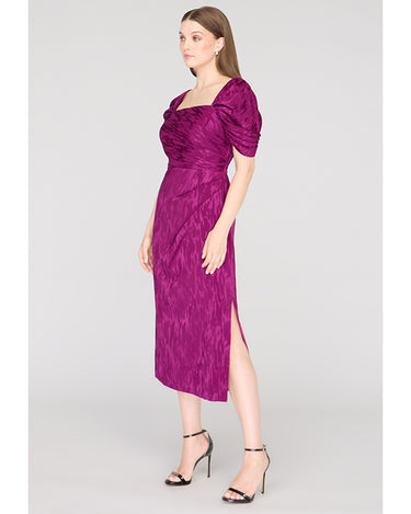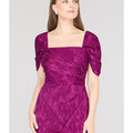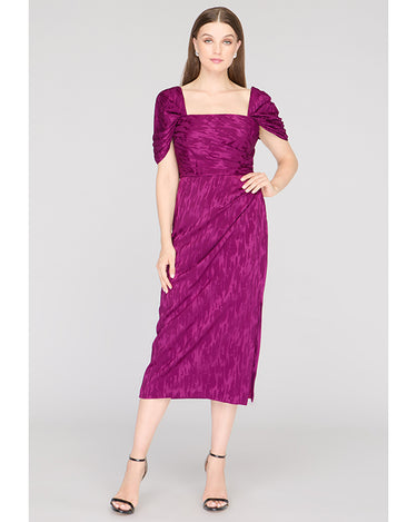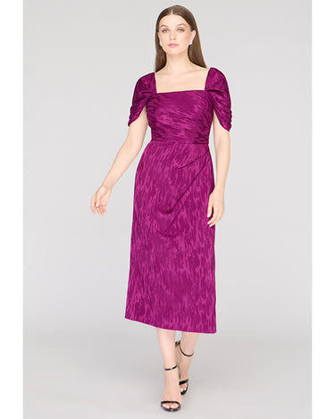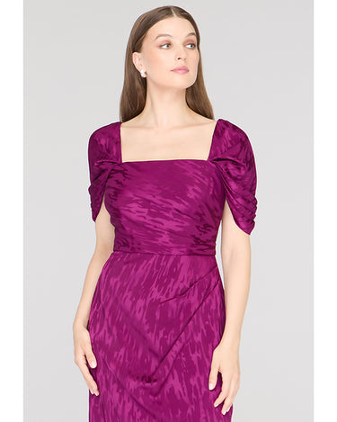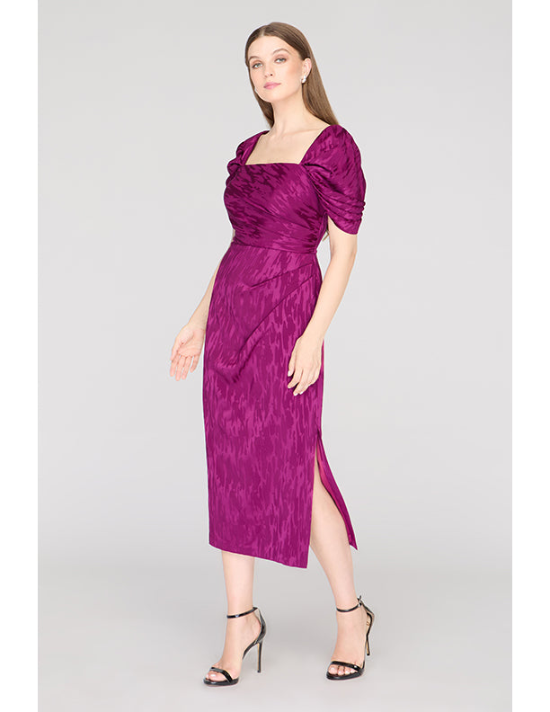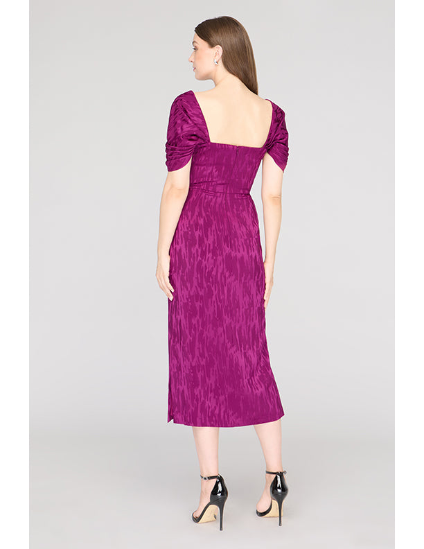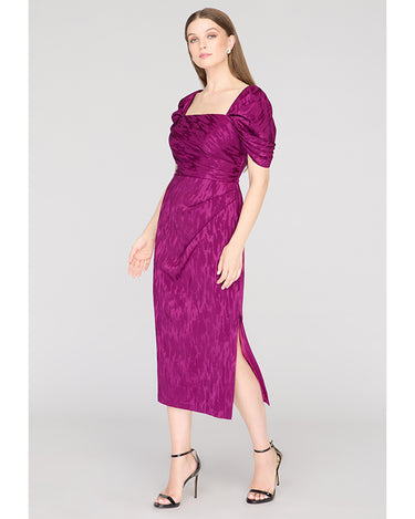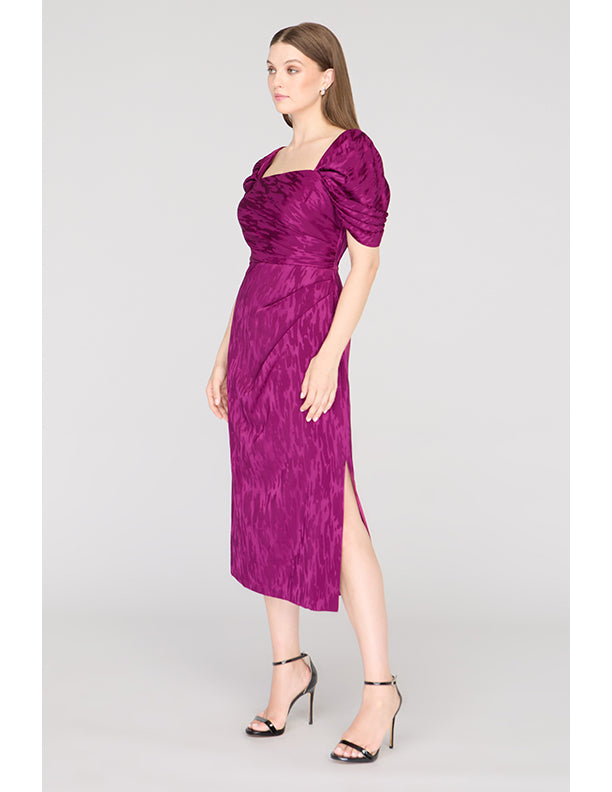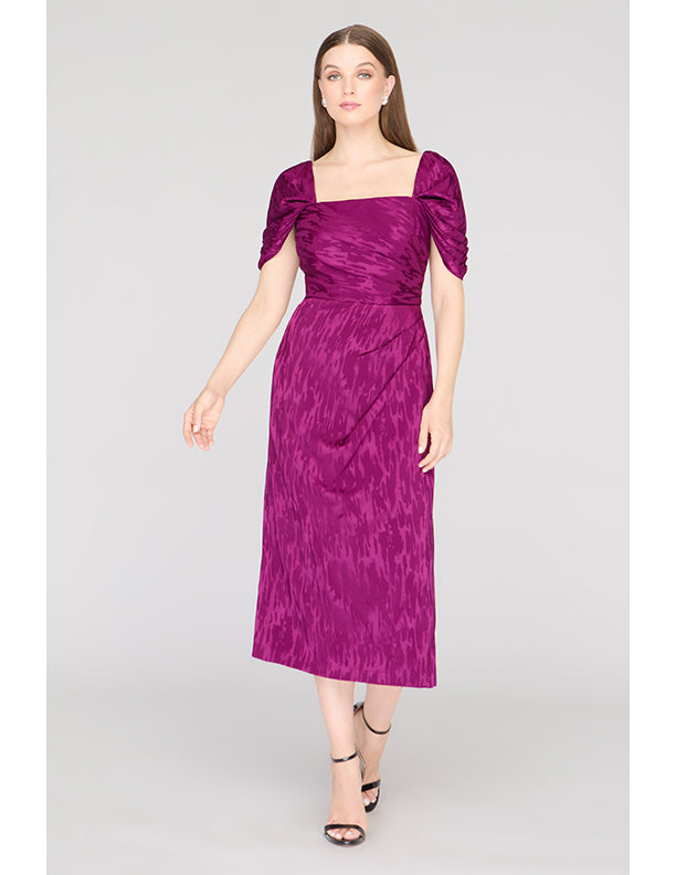 Crafted in a stretchy ikat-patterned jacquard, this cocktail sheath dress features a sculpted square neckline, flattering pleated bodice, and convertible puff sleeves—wear them on or off the shoulder. A standout for weddings, dinner parties, or RSVP-heavy weekends.