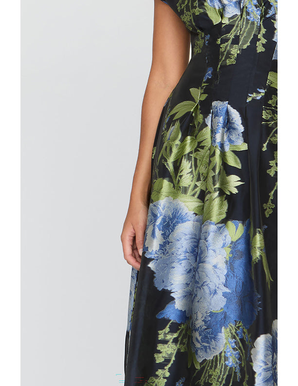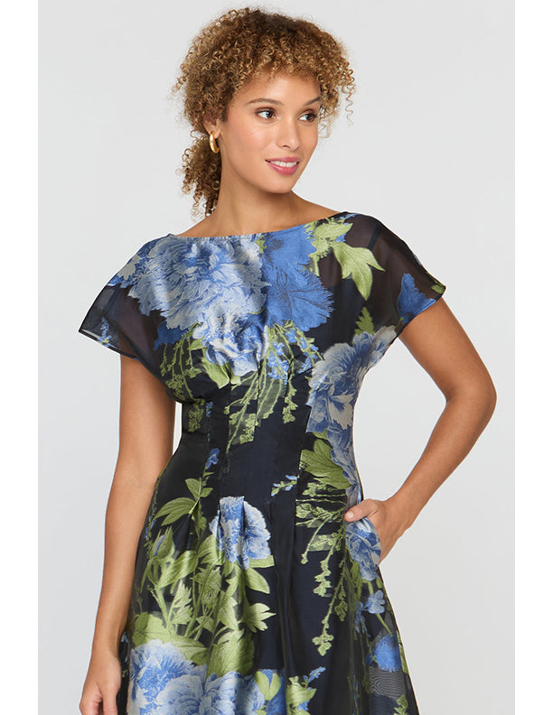 Luminous organza jacquard in a striking new colorway revives a beloved floral pattern with depth and dimension. Stitch-and-release pleats create sculptural movement, while the sheer neckline layered over a slip lining adds a soft illusion effect. A polished choice for rehearsal dinners, cocktail events, Derby days, and wedding guest moments.