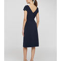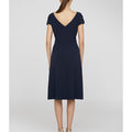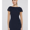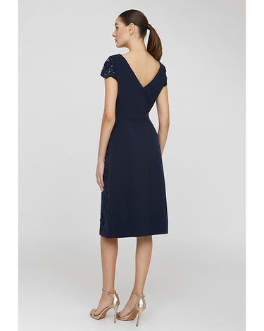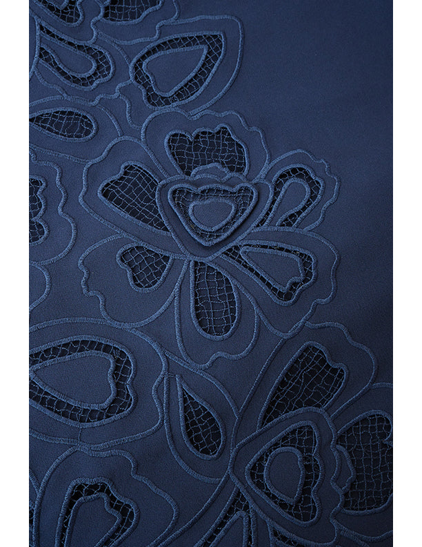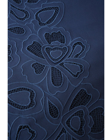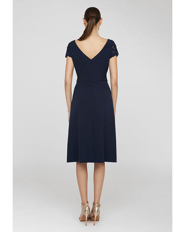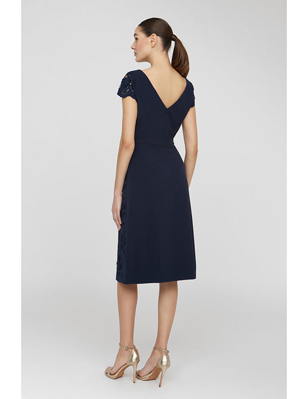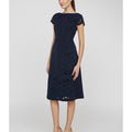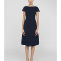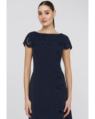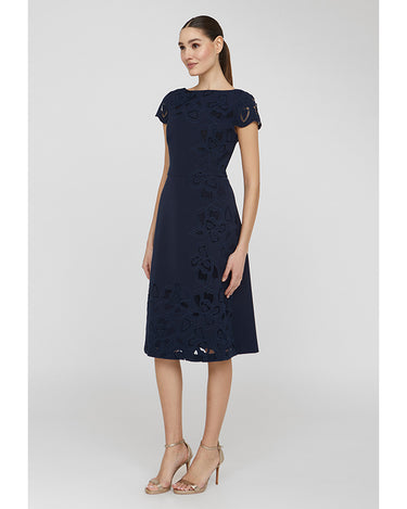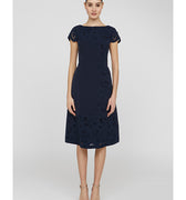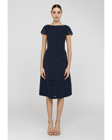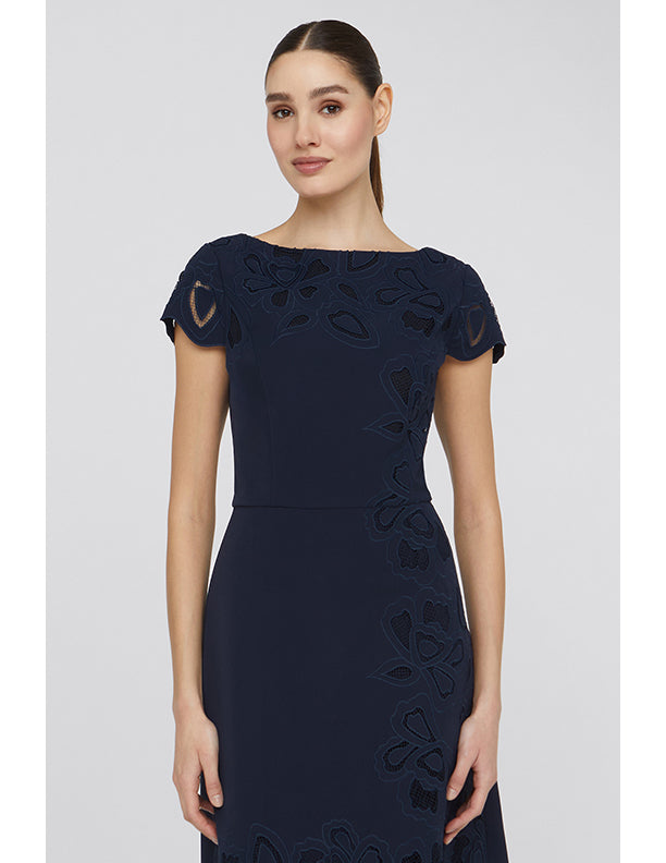 A polished pick for office parties, fall luncheons, or dressed-up dinners. Cut in embroidered stretch crepe, this fit-and-flare midi dress features dimensional eyelet motifs placed along the sleeves, hem, and bodice. Finished with a bateau neckline and sculpted short sleeves, it’s equal parts timeless and textural.