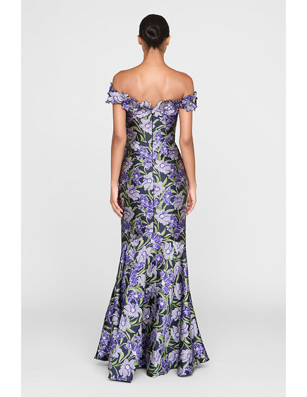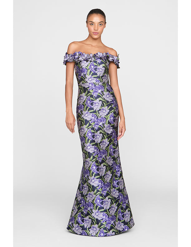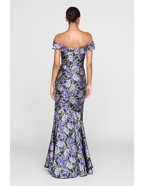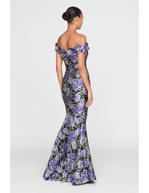 Floral jacquard gown in a rich violet-and-ivy palette, designed with dimensional blooms tracing the neckline for a standout finish. Structured through the body for a flattering, sculpted look with a polished sweep at the hem. A special pick for black-tie weddings, MOB moments, and gala nights.